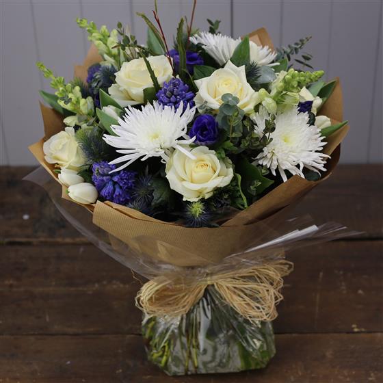 A beautiful seasonal selection of true blue and white flowers complemented with foliage's.
