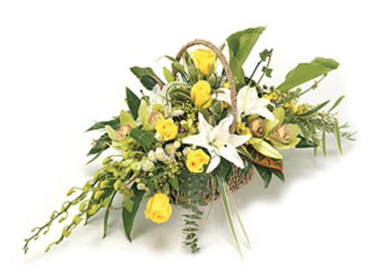 A Beautiful Trug basket filled with Easter Lilies and Orchids in Whites and Yellows with seasonal foliage.