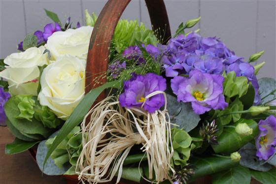 A garden trug basket filled with seasonal blooms. The perfect gift for any occasion.