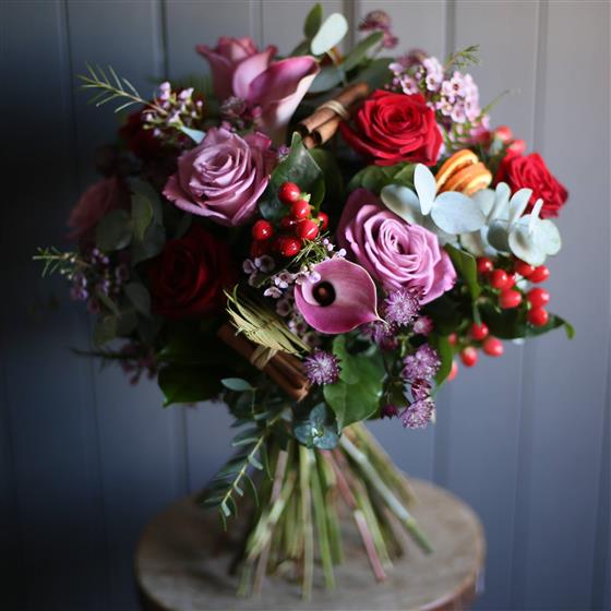 A stunning collection of Plum, Mauve and Red Flowers including Roses, Calla Lilies and Berries, with scented Eucalyptus Foliage.