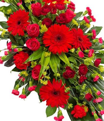 Classic Red Double Ended Spray, the image and price shown is of a 2ft design. The image contains Gerbera's, Carnations and Roses as the focal flowers.