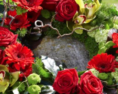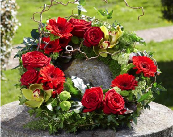 Red and Green Contemporary Wreath that includes Roses, Gerbera's and Orchids as the focal flowers. The price shown is for a 12" wreath and the image shown is a representation of a 14" wreath design.