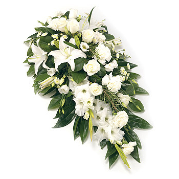 A classic single ended spray of white Roses, Lilies, Eustoma and Gladioli with dark green foliage. Size: 69cm (27").