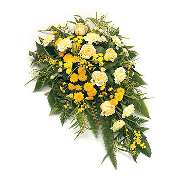 A delicate country style single ended spray, with Lemon Roses, yellow Chrysanthemums & Mimosa combined with beautiful foliage. Size: 58cm (23").
