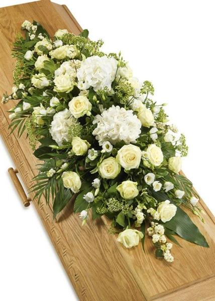 White and green coffin spray that includes Hydrangea and Roses as the focal flowers. The standard price shown is for a 3ft coffin spray and the image is a representation of a 4ft spray.
