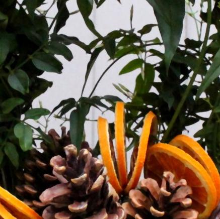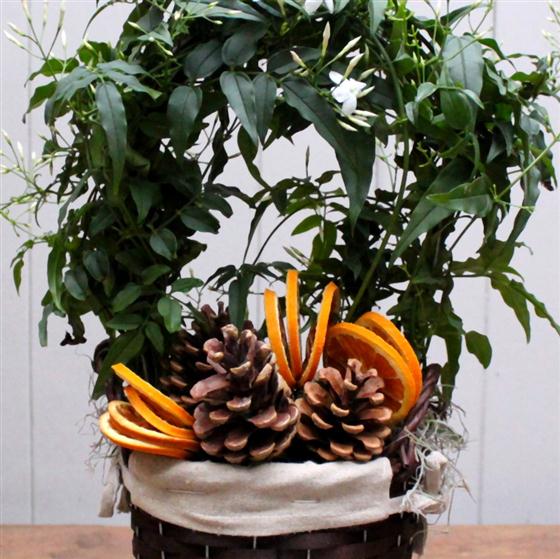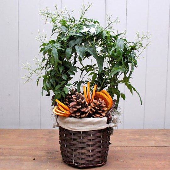 Highly scented jasmine plant presented in a container or Basket with seasonal touches of orange slices and fir cones.